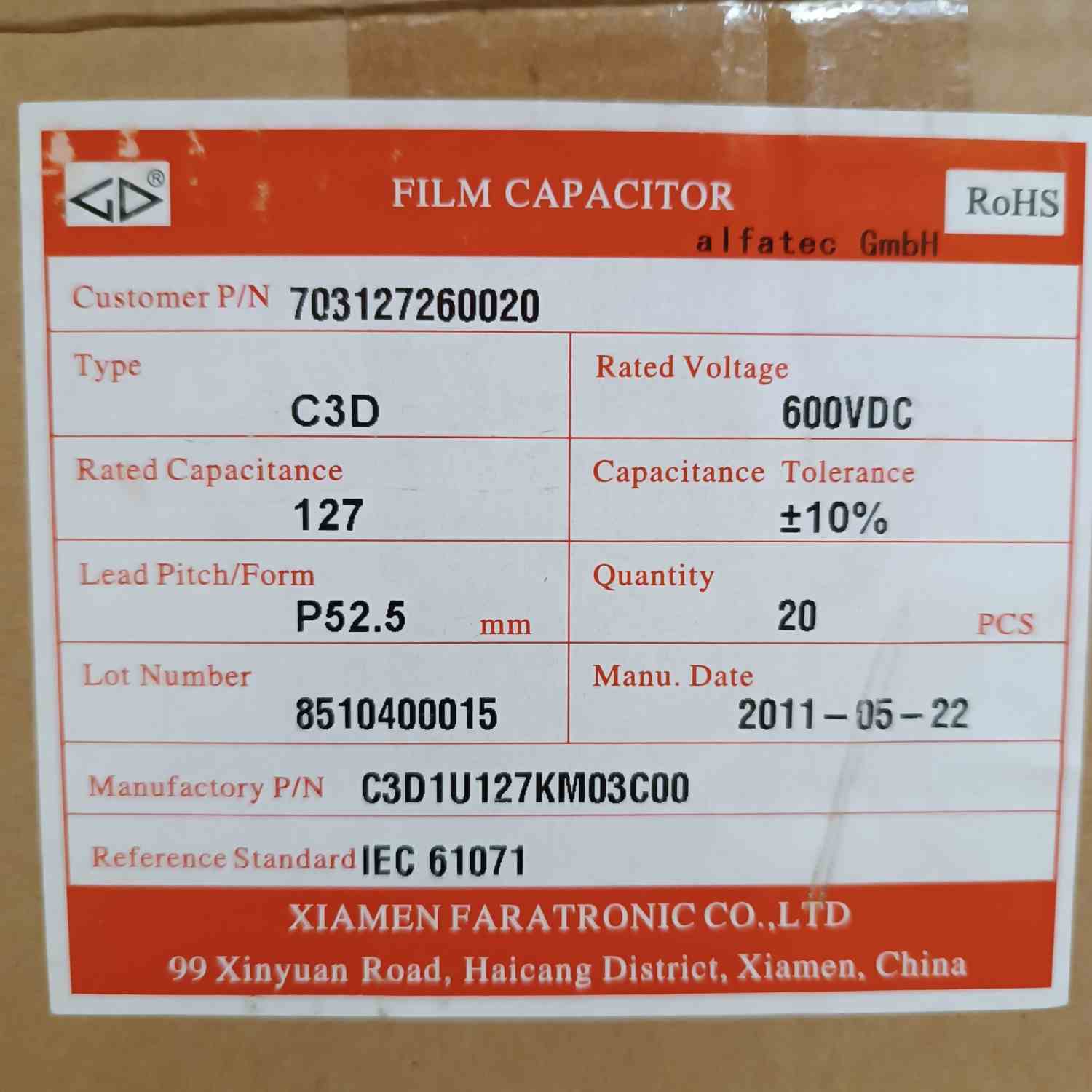 C3D1U127KM03C00 120MF 600V 52.5mm XIAMEN POLYESTER KONDANSATÖR